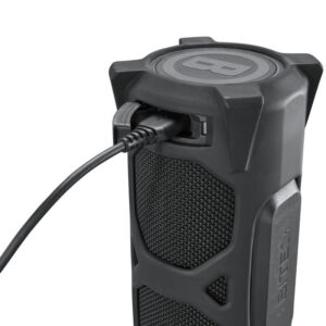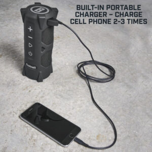 Una batería de larga duración permite al Bushnell Outdoorsman reproducir música durante 10 horas. Los 2 puertos micro USB de carga permiten cargar el altavoz Bluetooth con el cable de carga micro USB incluido o utilizar el altavoz como un cargador con suficiente batería en una carga completa para cargar la mayoría de los teléfonos móviles 2-3 veces. Ideal para estar en el campamento mientras disfrutas al aire libre.