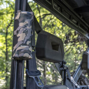 Con una certificación impermeable IPX6, el altavoz Bushnell Outdoorsman está totalmente protegido contra salpicaduras, ideal para la ducha y resistente al agua en cualquier situación que no sea sumergirse bajo el agua. Gracias a las dos fundas de goma EXO Armor (una negra y otra de camuflaje) que se montan fácilmente es resistente contra caídas y golpes.