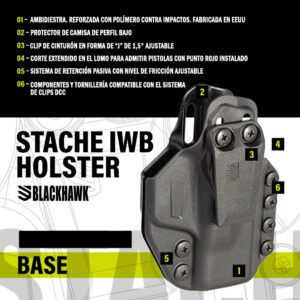 BLACKHAWK! presenta la nueva funda modular para transporte oculto más avanzada tecnológicamente que ha sido diseñado hasta la fecha, la Stache™ IWB. Diseñada por profesionales, el sistema de funda Stache™ IWB es la solución definitiva para el transporte diario, superando las limitaciones de diseño y material de Kydex. A través de una ingeniería meticulosa, la funda Stache™ ofrece la combinación óptima de comodidad, rigidez y modularidad; una solución que no es posible con Kydex. Está diseñada para usarse dentro del pantalón, construida en polímero moldeado por inyección reforzado contra impactos y es compatible con una variedad de accesorios para fundas Stache™ IWB.