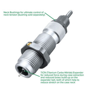 El juego de Dies de cuello de RCBS MatchMaster se compone de un die recalibrador de cuello desempistonador con el sistema de Bushings y un die posicionador de bala con ventana y micrómetro, ambos de grado Match. Cada die RCBS Matchmaster está fabricado en acero endurecido, escareado con herramientas de máxima precisión y ha sido pulido a mano.