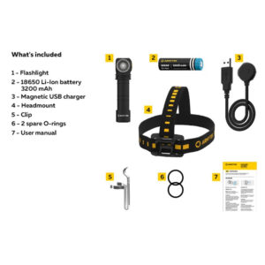 – Cómodo soporte para la cabeza con dos bandas elásticas suaves, soporte de plástico liviano y anillo de goma para fijación adicional. Las bandas sujetan la linterna de forma segura, no rozan la piel y no dejan marcas. La linterna se instala y retira fácilmente y gira 180° en el soporte. El anillo de silicona de liberación rápida proporciona una fijación adicional.