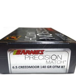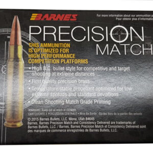 Las balas Precision Match se cargan con un proyectil BT OTM (Open Tip Match) con una larga cola de bote y un alto coeficiente balístico. Estas cargas están diseñadas para una precisión extrema a distancias extremas. El nivel más alto de consistencia se debe a desviaciones estándar excepcionalmente bajas y a variaciones extremas bajas debido al compromiso inquebrantable de exigencia en la fabricación de Barnes y altos estándares de selección de componentes. De hecho, esta munición produce un nivel de consistencia que es difícil de igualar incluso cuando se carga a mano.