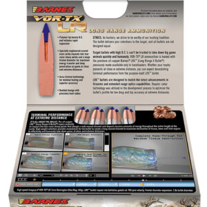 La munición LRX de BARNES se ha diseñado para disparar a largas distancias con una precisión extraordinaria. Su configuración se basa en la probada y exitosa TTSX pero con ojiva y cola de bote alargados. Con ello se consigue un coeficiente balístico superior en hasta un 18% en proyectiles homólogos.