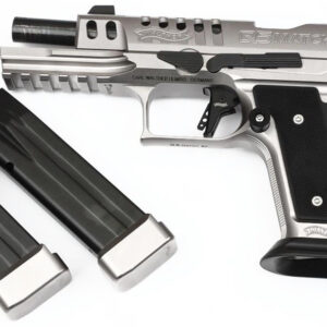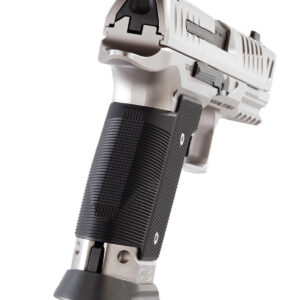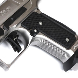 Creada con la aprobación de la IPSC. Además, después de quitar el embudo del cargador anodizado de bajo perfil, esta pistola de 9 milímetros también puede ser una ganadora en la clase de producción. La «Black Tie» ofrece al tirador una amplia gama de flexibilidad: 2 cargadores de 17 tiros, mira frontal negra más alza trasera dentada, ajustable con un solo clic.