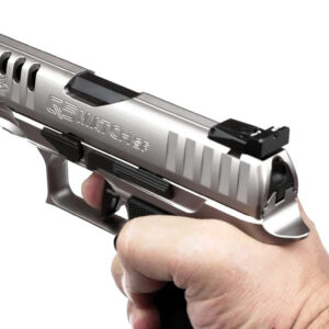 – Viene con 2 cargadores de 17 tiros con base metálica en acabado mate y un fanel de alto rendimiento Walther.