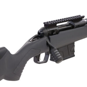 Tratándose de dos tetones el acerrojado es a 90°, como ocurre con los Remington. Para facilitar y acelerar el mismo, la maneta tiene una perilla muy del gusto táctico, sobredimensionada y con varias bandas de moleteado. Este sistema de acerrojado tiene una gran fiabilidad, los cartuchos se sacan limpiamente del cargador y las vainas se expulsan de manera fiable después de cada disparo. La acción trae de serie un rail Picatinny de la casa EGW, fabricado en aluminio con 20 MOAs para la colocación de un visor.
